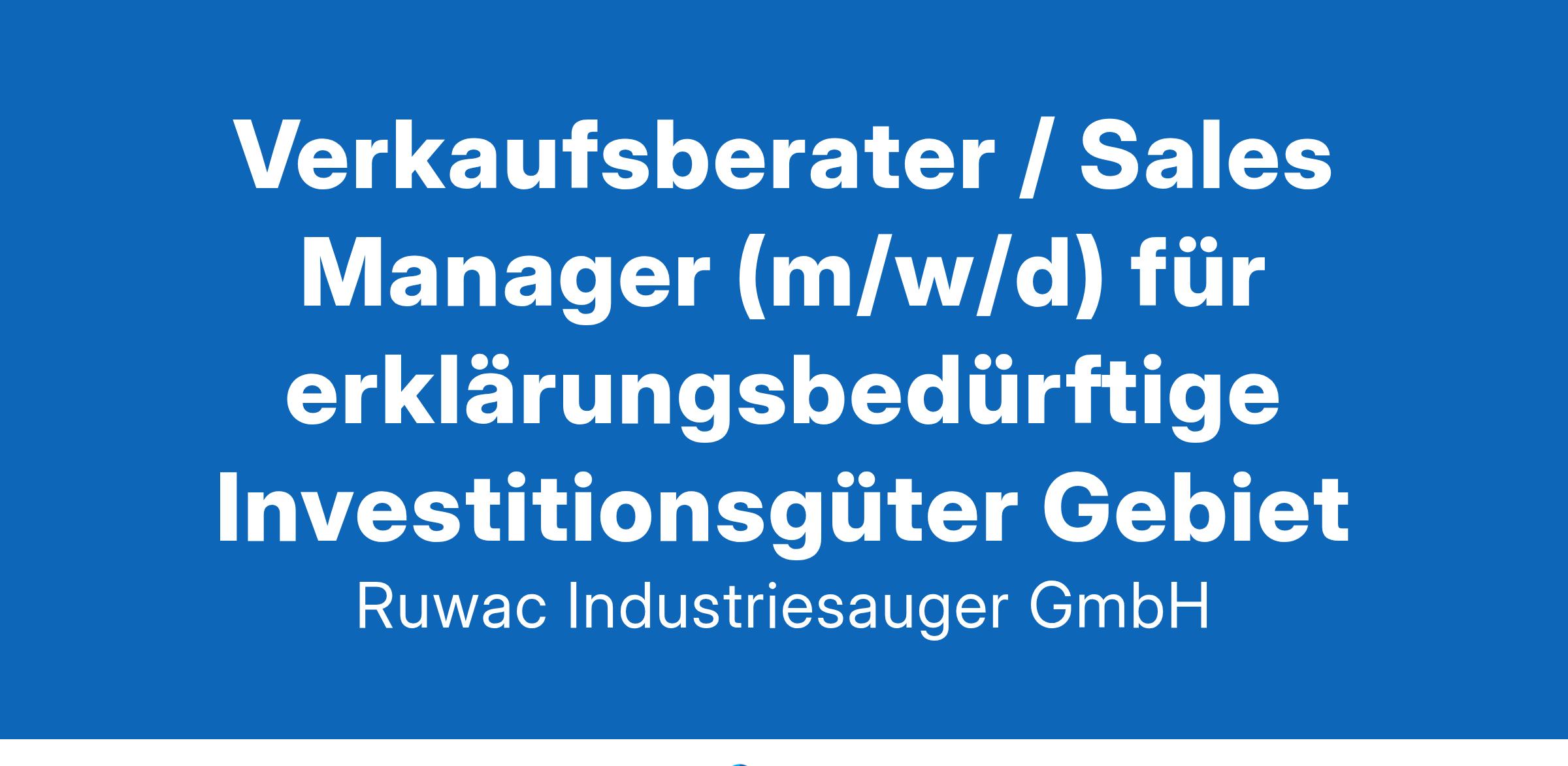 Verkaufsberater / Sales Manager (m/w/d) für erklärungsbedürftige Investitionsgüter Gebiet: Mittelhessen / Mittelrhein / Südeifel Der Fokus Deiner abwechslungsreichen Tätigkeit liegt in der eigenständigen Betreuung Deines Verkaufsgebietes. Du berätst Kunden und akquirierst Neukunden im Außendienst. Unterstützt wirst Du dabei durch unser CRM-System und unseren Innendienst. Deine Aufgaben Betreuung des bestehenden Kundenstammes sowie die Gewinnung neuer Interessenten/Kunden Beratung der Kunden beim Einsatz unserer Industriesauger und Absauganlagen in Verbindung mit der Erarbeitung kundenspezifischer Lösungen Erstellung und Verfolgung von Angeboten Beteiligung an Messen und Kundenevents Verkauf nicht aus dem Katalog heraus, Vorführungen und Einweisungen der Geräte beim Kunden sind essenzieller Bestandteil Deiner Arbeit Dein Profil Abgeschlossene kaufmännische und/oder technische Ausbildung Mehrjährige Erfahrung im Vertrieb von technischen Produkten Souveränes Auftreten Flexibilität und Teamfähigkeit Ausgeprägte Kontakt- und Überzeugungsstärke Idealerweise Wohnort im Verkaufsgebiet Wir freuen uns über deine Bewerbung per Mail an bewerbung@ruwac.de UNSER UNTERNEHMEN "Wir saugen alles!" – Unser Anspruch ist es, für jeden Bedarf die passende Lösung zu finden. Und dann einfach die besten Sauger der Welt zu bauen. Was so simpel klingt, ist das Ergebnis jahrzehntelanger Erfahrung und absoluter Kompromisslosigkeit bei der Qualität. Schließlich sind wir seit fast 50 Jahren dabei! Heute zählen Ruwac Industriesauger weltweit zum Zuverlässigsten, was im Bereich der mobilen und stationären Absauganlagen zu haben ist. WIR BIETEN DIR U.A.: FLACHE HIERARCHIEN FIRMENEVENTS BIKELEASING CORPORATE BENEFITS Ruwac Industriesauger GmbH www.ruwac.de +49 (0) 52 26 - 98 30-0