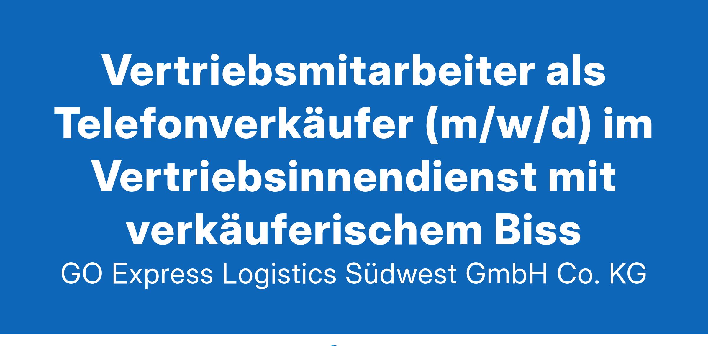 Wer zufriedene Mitarbeitende möchte, sollte liefern können! Wir von GO! Express & Logistics sind Europas größter, unabhängiger Anbieter von Express- und Kurierdienstleistungen. Über 4.000 Mitarbeitende sorgen für den Transport von jährlich mehr als 9,7 Millionen Sendungen. Ob eilige Gefahrguttransporte oder wichtige Dokumente wir liefern, regional, national und global. So viel Leistung schaffen wir nur mit Kolleginnen und Kollegen, die intensiv gefördert werden und lange bei uns bleiben. Klingt das nach einem Arbeitsumfeld für Dich? Dann verstärke unser Team als Vertriebsmitarbeiter als Telefonverkäufer (m/w/d) im Vertriebsinnendienst mit verkäuferischem Biss in Stuttgart Herzlich willkommen bei GO! an unserem Standort in Weilimdorf im Stuttgarter Nordwesten! In dieser verkehrsgünstig gelegenen Station legt sich jeden Tag ein 38-köpfiges Team für unsere gemeinsamen Ziele ins Zeug: logistische Höchstleistungen vollbringen und das in einer freundlichen -harmonischen Atmosphäre. In unseren modernisierten Büros erwartet Sie ein lockeres und respektvolles Miteinander und offene Türen wie Ohren für Ihre Ideen. Lass uns zusammen etwas bewegen! Hier zeigst Du, was Du kannst: Deine freundliche Telefonstimme gewinnt neue Kunden und überzeugt sie, sich mit ihren nationalen wie internationalen Anfragen und Aufträgen an uns zu wenden. Sich die Aufgaben im Vertrieb selbst einzuteilen und dabei die Ziele und die Kosten nie aus den Augen zu verlieren, hört sich nach Dir an? Dabei finden die Kunden in Dir eine kompetente Ansprechperson, die ihnen routiniert alle Fragen zu unseren Produkten, Laufzeiten und Services beantwortet und sie umfassend berät. Klar, dass Du auch im Fall der Fälle unseren Kunden zur Seite stehst, Reklamationen professionell aufnimmst und diese nach unseren Qualitätsstandards nachverfolgst bzw. klärst. Nicht zuletzt gehst Du proaktiv auf unsere Kunden zu, informierst sie über neue Produkte und Leistungen. Diese Qualifikationen bringst Du mit: Du bist ein Verkaufstalent und hast Spaß am souveränen Umgang mit Kunden und potentiellen Kunden. Am Ball bleiben: Du klingelst aktiv bei potenziellen Kunden durch und begeisterst sie von unseren Logistikleistungen. Eine abgeschlossene kaufmännische Ausbildung. Grundkenntnisse in Englisch. Wir freuen uns auf einen selbstständigen, engagierten Teamplayer, für den der Kunde im Mittelpunkt steht, der eigene Ideen einbringt und stets freundlich und offen kommuniziert. Deine GO!odies bei uns: Corporate benefits Firmenlaptop und Firmenhandy Vermögenswirksame Leistungen Wertschätzendes, familiäres Miteinander Flache Hierarchie – Duz Kultur Kostenloses Wasser und Kaffee satt Gute Verkehrsanbindung (Bus & Bahn) Kostenlose Parkplätze Liegt 2,5 km von der Autobahnausfahrt Stuttgart-Feuerbach (A81) entfernt Neugierig geworden? Dann freuen wir uns auf Deine Bewerbung! GO! Express & Logistics Südwest GmbH & Co. KG Patrick Kreis Rutesheimer Str. 1 70499 Stuttgart Für weitere Infos oder Rückfragen steht Dir Dein Ansprechpartner Patrick Kreis gerne zur Verfügung: Tel.: 015158729034 GO! Express & Logistics Südwest GmbH & Co. KG | Rutesheimer Str. 1 | 70499 Stuttgart | wwww.general-overnight.com