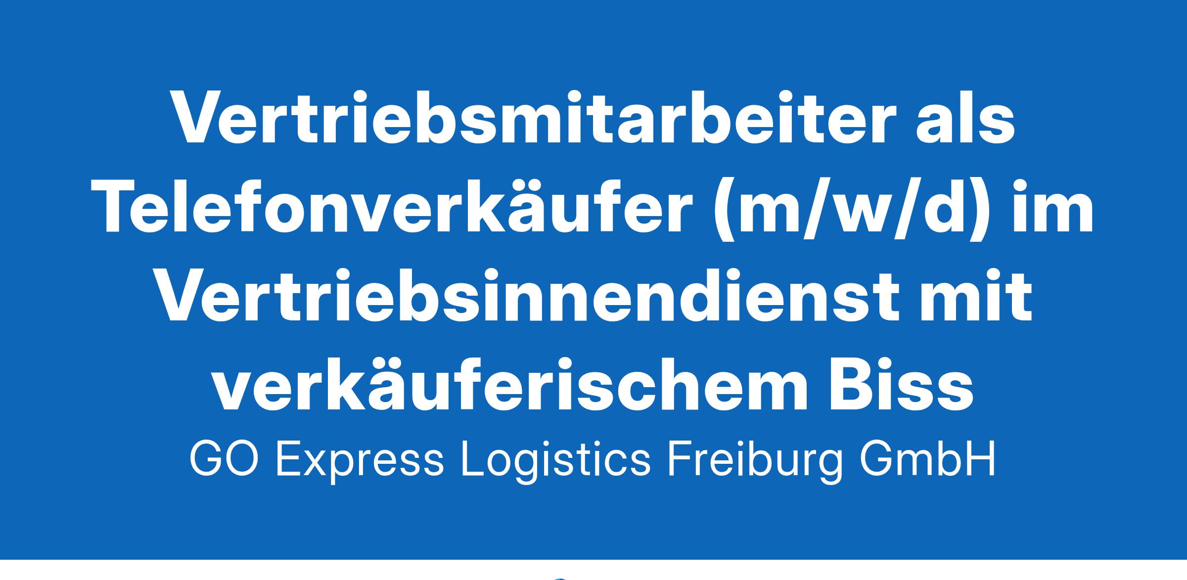 Wer zufriedene Mitarbeitende möchte, sollte liefern können! Wir von GO! Express & Logistics sind Europas größter, unabhängiger Anbieter von Express- und Kurierdienstleistungen. Über 4.000 Mitarbeiterinnen und Mitarbeiter sorgen für den Transport von jährlich mehr als 9,7 Millionen Sendungen. Ob eilige Gefahrguttransporte oder wichtige Dokumente wir liefern – regional, national und global. So viel Leistung schaffen wir nur mit Kolleginnen und Kollegen, die intensiv gefördert werden und lange bei uns bleiben. Klingt das nach einem Arbeitsumfeld für dich? Dann verstärke unser Team als Vertriebsmitarbeiter als Telefonverkäufer (m/w/d) im Vertriebsinnendienst mit verkäuferischem Biss in Freiburg im Breisgau Aufgepasst! Denn schon bald heißt es für dich: GO! Und zwar mitten hinein in unser familiäres Team am Standort Freiburg, der Perle des Breisgaus. Was wir hier den lieben langen Tag tun? Schnell und zuverlässig exzellente Logistikleistungen auf den Weg bringen – vor allem für Kunden aus der Medizin- und Pharmabranche. Freu dich auf freundliche, helle und moderne Büros und auf ein Team, in dem alle an einem Strang ziehen. Du willst im Job viel bewegen und möglichst eigenverantwortlich arbeiten? Dann los! Hier zeigst Du, was Du kannst: Deine freundliche Telefonstimme gewinnt neue Kunden und überzeugt sie, sich mit ihren nationalen wie internationalen Anfragen und Aufträgen an uns zu wenden. Sich die Aufgaben im Vertrieb selbst einzuteilen und dabei die Ziele und die Kosten nie aus den Augen zu verlieren, hört sich nach Dir an? Dabei finden die Kunden in Dir eine kompetente Ansprechperson, die ihnen routiniert alle Fragen zu unseren Produkten, Laufzeiten und Services beantwortet und sie umfassend berät. Klar, dass Du auch im Fall der Fälle unseren Kunden zur Seite stehst, Reklamationen professionell aufnimmst und diese nach unseren Qualitätsstandards nachverfolgst bzw. klärst. Nicht zuletzt gehst Du proaktiv auf unsere Kunden zu, informierst sie über neue Produkte und Leistungen. Du betreust auch unsere Kunden in Villingen-Schwenningen im Vertrieb Innendienst und hast so eine stationsübergreifende Position. Diese Qualifikation bringst Du mit: Du bist ein Verkaufstalent und hast Spaß am souveränen Umgang mit Kunden und potentiellen Kunden. Am Ball bleiben: Du klingelst aktiv bei potenziellen Kunden durch und begeisterst sie von unseren Logistikleistungen. Eine abgeschlossene kaufmännische Ausbildung. Grundkenntnisse in Englisch. Wir freuen uns auf einen selbstständigen, engagierten Teamplayer, für den der Kunde im Mittelpunkt steht, der eigene Ideen einbringt und stets freundlich und offen kommuniziert. Ihre GO!odies bei uns: Attraktives Bonussystem und Gutscheinkarten Corporate Benefits & Mitarbeiterevents Vermögenswirksame Leistungen Betriebliche Altersvorsorge Wasser, Kaffee und Tee Gute Verkehrsanbindung (Bus & Bahn) Kostenlose Parkplätze Liegt 5 Minuten von der Autobahnausfahrt (A5) entfernt Neugierig geworden? Dann freuen wir uns auf Deine Bewerbung! GO! Express & Logistics Freiburg GmbH Burkheimer Str. 9 | 79111 Freiburg
