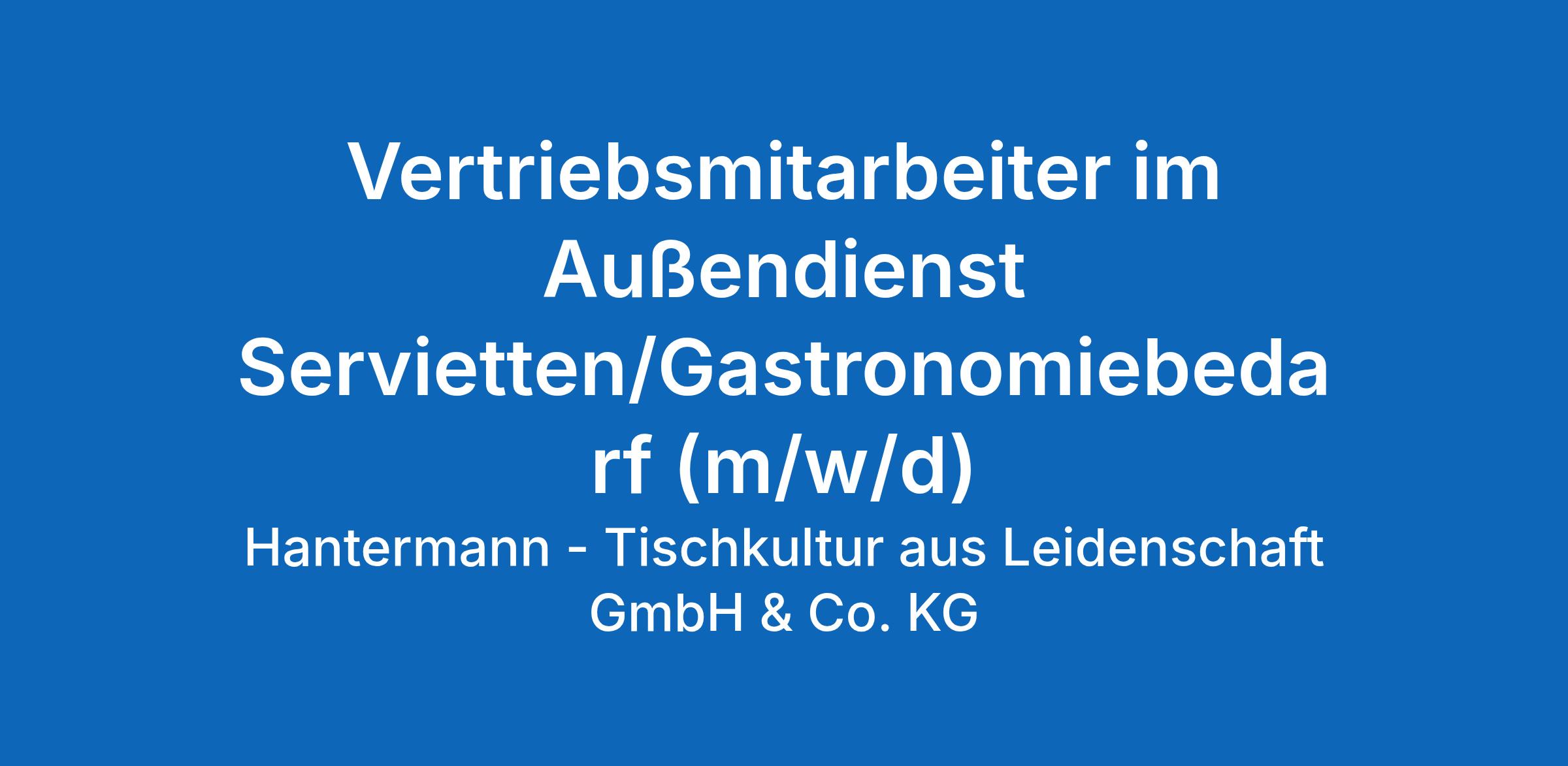 Musterkoffer auf und zu ist nicht unsere Philosophie. Wir suchen Menschen, die mit Leidenschaft und Herz neue Kunden für uns gewinnen und Bestandskunden ausbauen. Als offensives Mitglied unseres Außendienstteams kennen und respektieren Sie die Öffnungszeiten Ihrer Zielgruppe und richten Ihren Arbeitseinsatz daran aus. Profitieren Sie von dem Branding- Knowhow im Hause Hantermann mit einer konsequenten Corporate-Design-Vertriebsphilosophie. Ein wichtiger Wettbewerbsvorteil. Warum? Kein Betrieb in Deutschland produziert mehr individuell bedruckte Servietten und Besteckservietten als Hantermann.