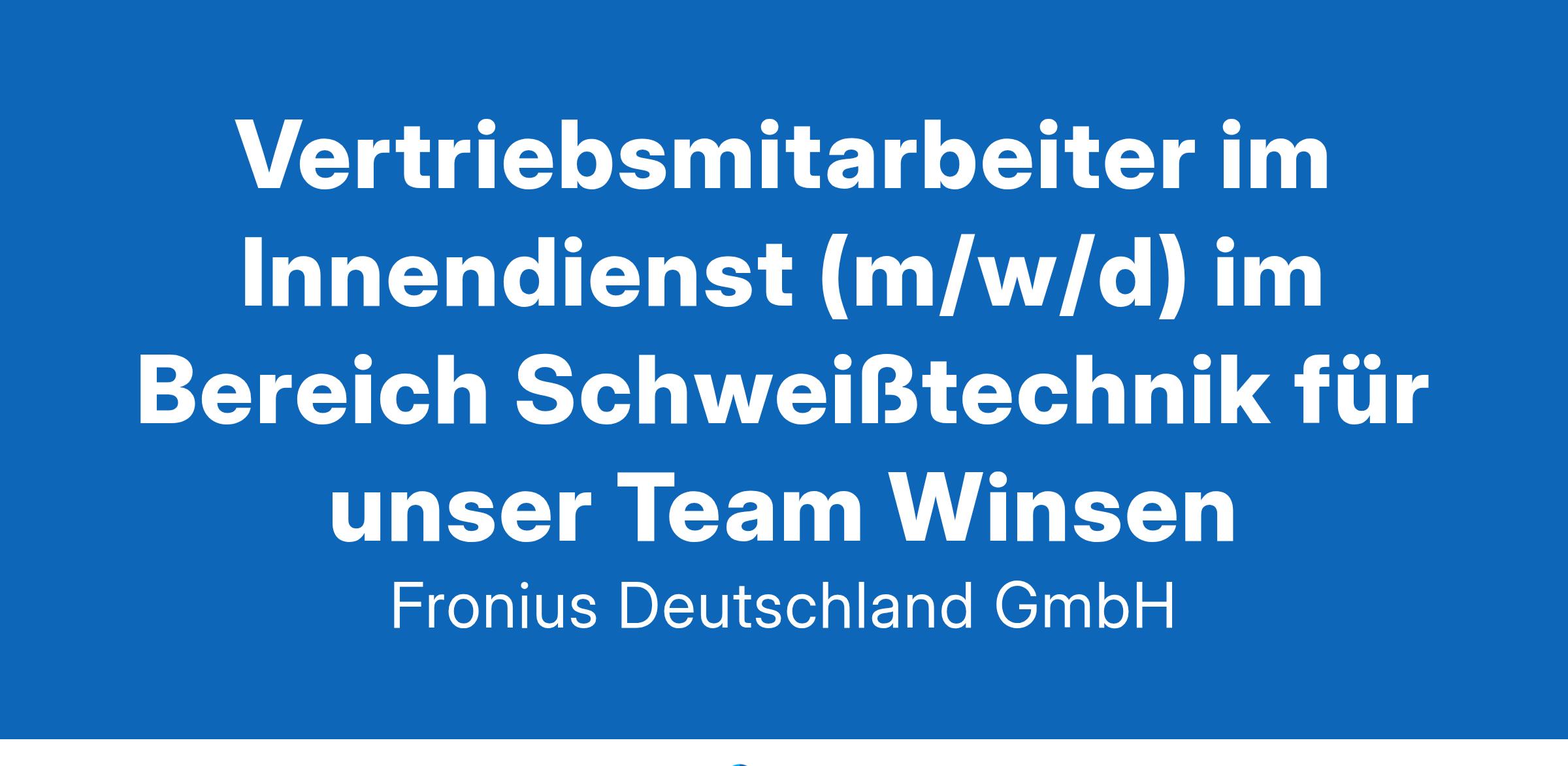 Vordenken, verbinden, erreichen: Entlang dieser Werte denken wir über die Grenzen des Machbaren hinaus und schaffen so geniale Produkte und Lösungen für Batteriesysteme, Schweißtechnik und Solarelektronik. Vertriebsmitarbeiter im Innendienst (m/w/d) im Bereich Schweißtechnik für unser Team Winsen Deine Aufgaben: Auftragserfassung und -nachverfolgung inkl. Bonitätsprüfung Kundendatenerfassung im CRM System einpflegen / aktualisieren und verwalten Umfassende Kundenbetreuung Angebotserstellung und deren Nachverfolgung Bestellungen und Aufträge abwickeln Vorbereitung und Unterstützung bei der Inventur Bearbeitung von Reklamationen Dokumentenmanagement Lagerhaltung und Versand Schnittstelle zum Außendienst und anderen internen Abteilungen Unterstützung von Kundenevents Du verfügst über: Abgeschlossene kaufmännische Ausbildung Ausgeprägte Dienstleistungsmentalität Organisationstalent und eigenständiges Arbeiten Teamfähigkeit Wir bieten: Unbefristete, zukunftssichere und moderne Arbeitsplätze in einem nachhaltigen Unternehmen Familiäres Betriebsklima Attraktive Vergütung sowie Urlaubs- und Weihnachtsgeld und 30 Tage Jahresurlaub Gesundheitsförderung, Betriebliche Altersversorgung, Jobfahrrad (E-Bike), Corporate Benefits Ein anspruchsvolles Aufgabengebiet mit hoher Eigenverantwortung Möglichkeit zur kontinuierlichen Weiterbildung Are you ready for Fronius? Jetzt bewerben und Teil der Fronius Familie werden!