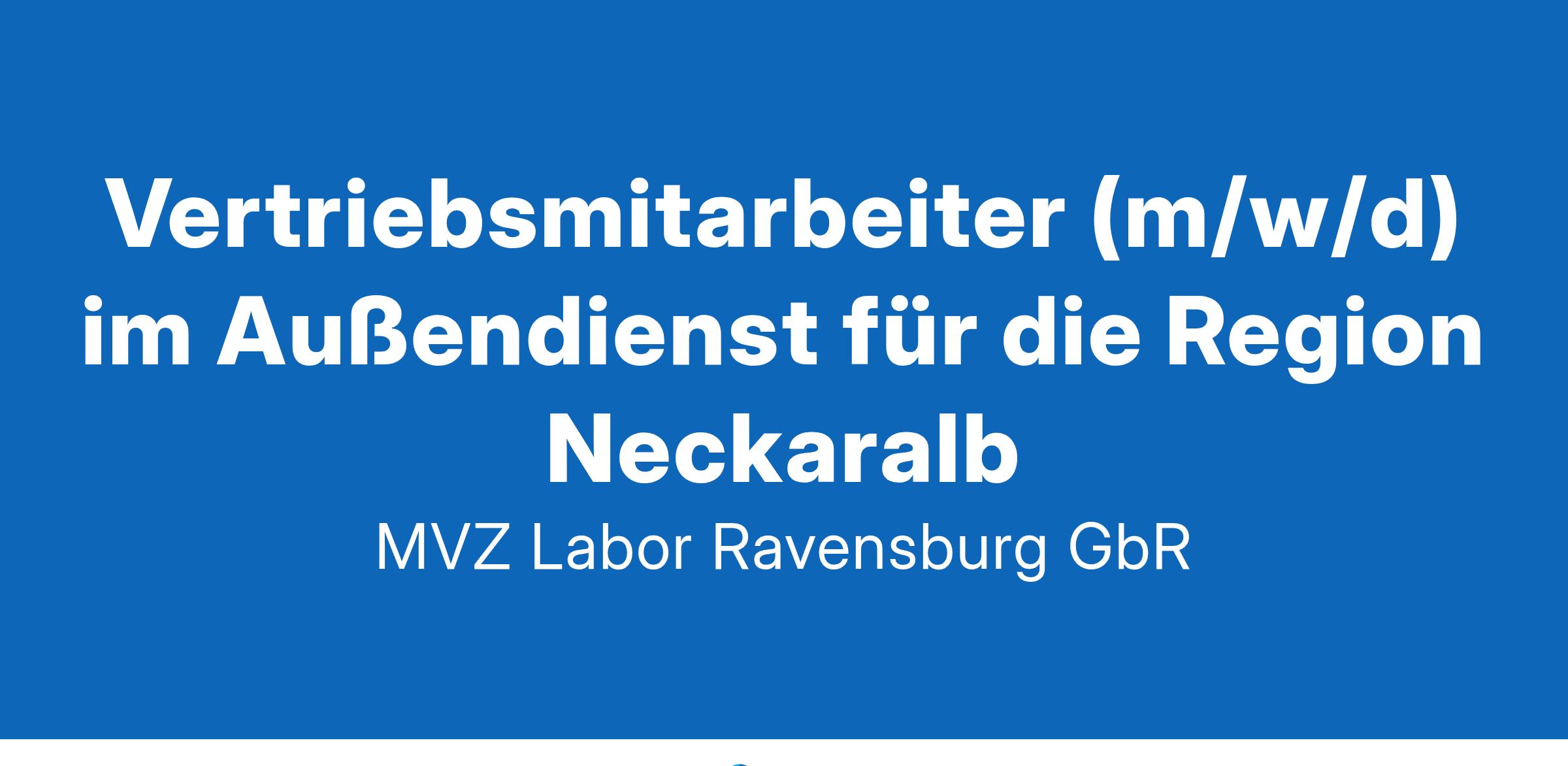 Mehr als Labor. Als medizinisches Labor zählen wir mit dem kompletten Spektrum der modernen Diagnostik zu Deutschlands führenden Privatlaboratorien. Im Mittelpunkt unserer Arbeit steht dabei das Wohlbefinden der Patienten. Über die Grenzen Oberschwabens hinaus vertrauen niedergelassene Ärzte und eine Vielzahl an Krankenhäusern seit mehr als 75 Jahren der Labordiagnostik des MVZ Labor Ravensburg. Mit Ihrem Einstieg in unser Labor erwartet Sie mehr als Kittel und Handschuhe! Werden Sie Teil unseres Teams! Zur Verstärkung unseres Teams suchen wir ab sofort in Vollzeit einen Vertriebsmitarbeiter (m/w/d) im Außendienst für die Region Neckaralb