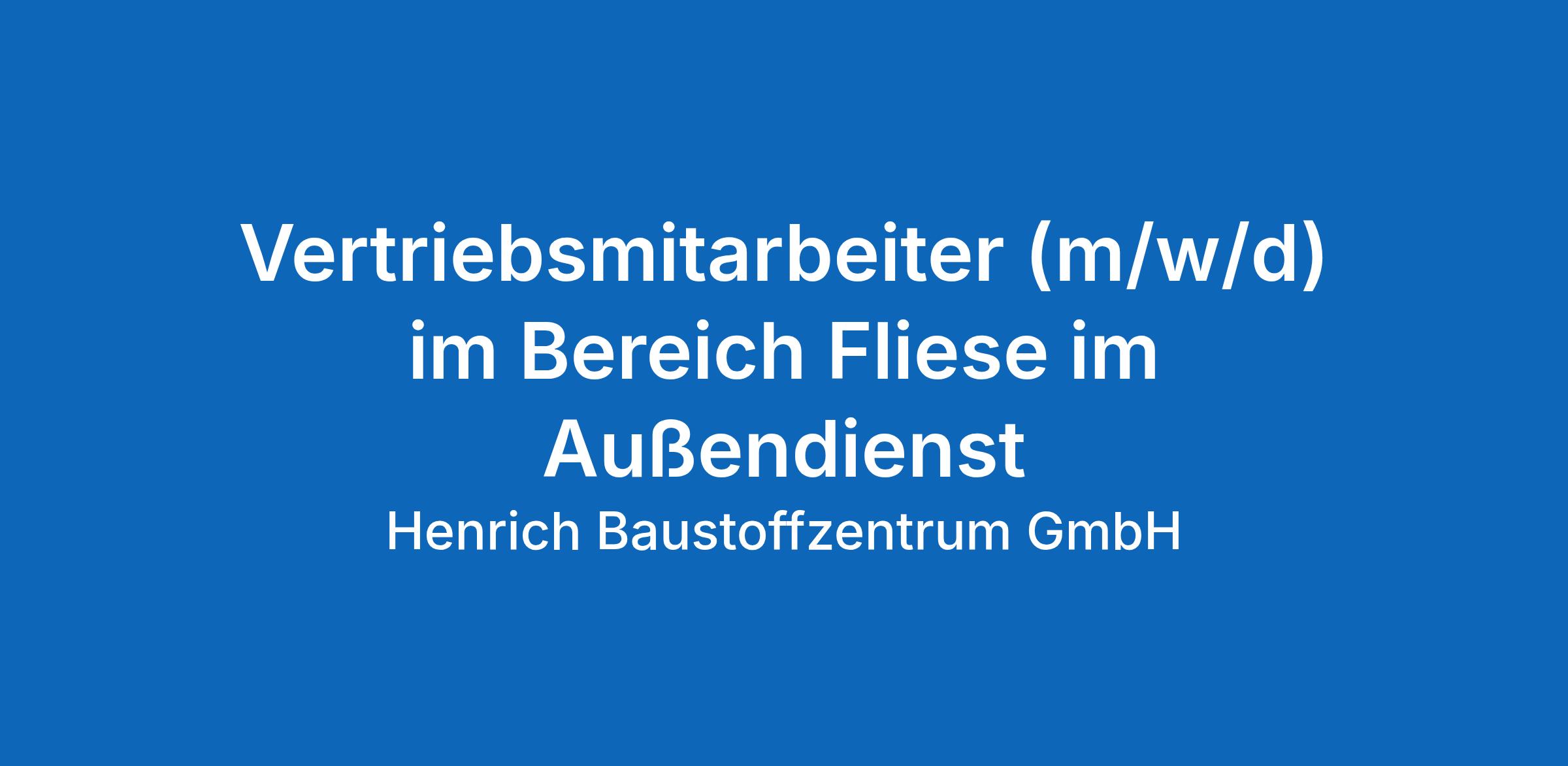 Wir suchen ab sofort einen Vertriebsmitarbeiter (m/w/d) im Bereich Fliese im Außendienst für unseren Standort in Bitburg. Freuen Sie sich auf ein engagiertes Team, welches Sie im Rahmen einer individuellen Einarbeitung im Team Henrich unterstützt!