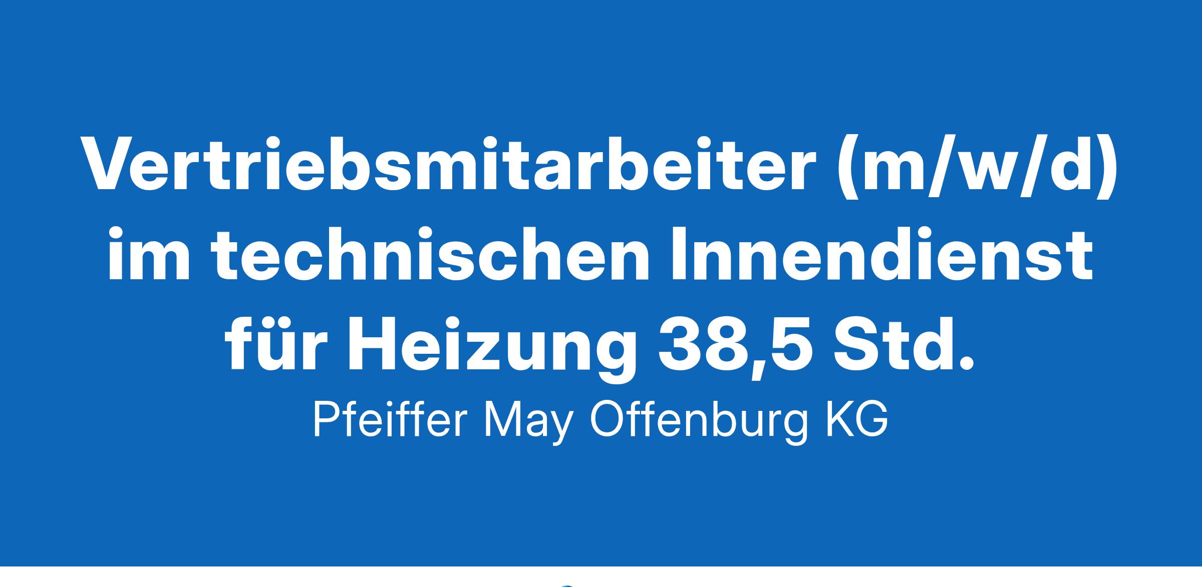 Werden Sie Mitglied in unserem engagierten Team und gestalten Sie mit uns die Zukunft der PFEIFFER & MAY Gruppe! Wir freuen uns auf Ihre Bewerbung über unser Karriereportal. Die PFEIFFER & MAY Gruppe ist ein Familienunternehmen in vierter Generation und beschäftigt mehr als 2500 Mitarbeitende, darunter über 240 Auszubildende. Als Haustechnikgroßhandel erstreckt sich unser Produktsortiment von modernster Sanitärtechnik über fortschrittliche Installationssysteme bis hin zu effizienten Heiz- und nachhaltigen Energielösungen wie PV- und Solaranlagen. Vertriebsmitarbeiter (m/w/d) im technischen Innendienst für Heizung 38,5 Std. Ihr Platz bei uns Verkauf ist Ihre Leidenschaft? Unsere auch! Als Vertriebsmitarbeiter (m/w/d) im technischen Außendienst bieten Sie technische Unterstützung und Beratung für unsere Kunden der PFEIFFER & MAY Gruppe. Ihr Ziel ist es, dass unsere technischen Produkte korrekt implementiert und genutzt werden können. Unser Einsatz – Ihre Vorteile Attraktives Gehalt mit Prämien und Zusatzleistungen (Urlaubs- und Weihnachtsgeld) Unbefristeter Arbeitsvertrag in einem krisensicheren Unternehmen und betriebliche Altersvorsorge mit Arbeitgeberzuschuss Langfristige Perspektive mit Entwicklungsmöglichkeiten am eigenen Standort und in der gesamten Gruppe Interne Weiterbildungsmöglichkeiten durch Seminare, Trainings und E-Learnings Nachhaltige Mobilität durch Ladestationen für E-Autos 38,5 Std./Woche und 30 Tage Urlaub Gemeinsam gestalten wir die Standards von morgen – Ihre Aufgaben Eigenverantwortlich telefonische Betreuung unserer Kunden Erstellung und Kalkulation von Angeboten bis hin zu deren Nachfassung und Abschluss Bearbeitung eingehender Anfragen mit technischer Beratung Erstellung von Hydraulikschemen und Auslegung von Fußbodenheizung Transparente Zusammenarbeit mit den Kolleg*innen aus dem Außendienst und deren aktive Unterstützung Sie begeistern uns — Ihr Profil Eine technische Ausbildung im Bereich SHK und entsprechende Berufserfahrung Begeisterung für das Koordinieren von komplexen Aufträgen und Spaß am Telefonieren Selbständige, transparente und zielorientierte Arbeitsweise Ansprechpartner: Melanie Manna Telefonnummer: 0781 5011110 E-Mail: melanie.manna@pum.de