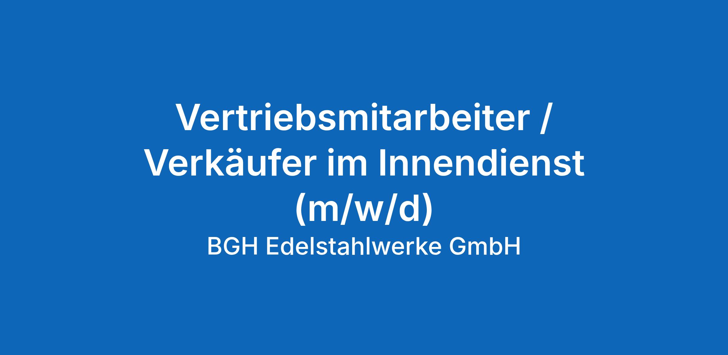 Die BGH Edelstahlwerke GmbH – ein Unternehmen der BGH Gruppe – sucht am Standort Neukieritzsch (Großraum Leipzig) ab 01.05.2026 zur Elternzeitvertretung einen Vertriebsmitarbeiter / Verkäufer im Innendienst (m/w/d).