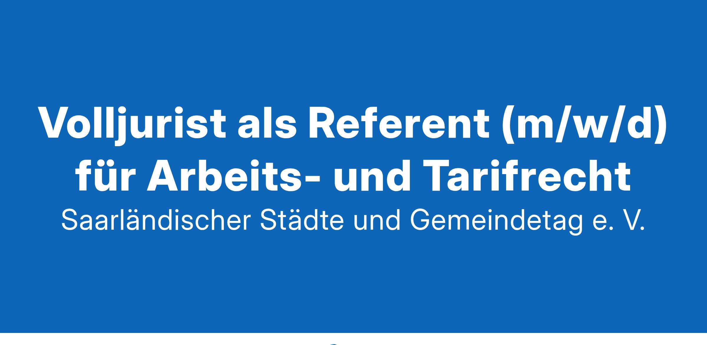 Volljurist als Referent (m/w/d) für Arbeits- und Tarifrecht Der Saarländische Städte- und Gemeindetag (SSGT), der auch die Geschäftsführung für den Kommunalen Arbeitgeberverband Saar (KAV Saar) wahrnimmt, sucht zum nächstmöglichen Zeitpunkt einen Volljuristen (m/w/d) als Referent (m/w/d) für Arbeits- und Tarifrecht beim Kommunalen Arbeitgeberverband Saar. Die Anstellung erfolgt zunächst befristet in Teilzeit im Umfang von bis zu 50 % einer Vollzeitbeschäftigung. Die Bewerbungsfrist endet am 21.02.2025. Die vollständige Stellenausschreibung finden Sie auf der Homepage des Kommunalen Arbeitgeberverbandes Saar www.kav-saar.de.