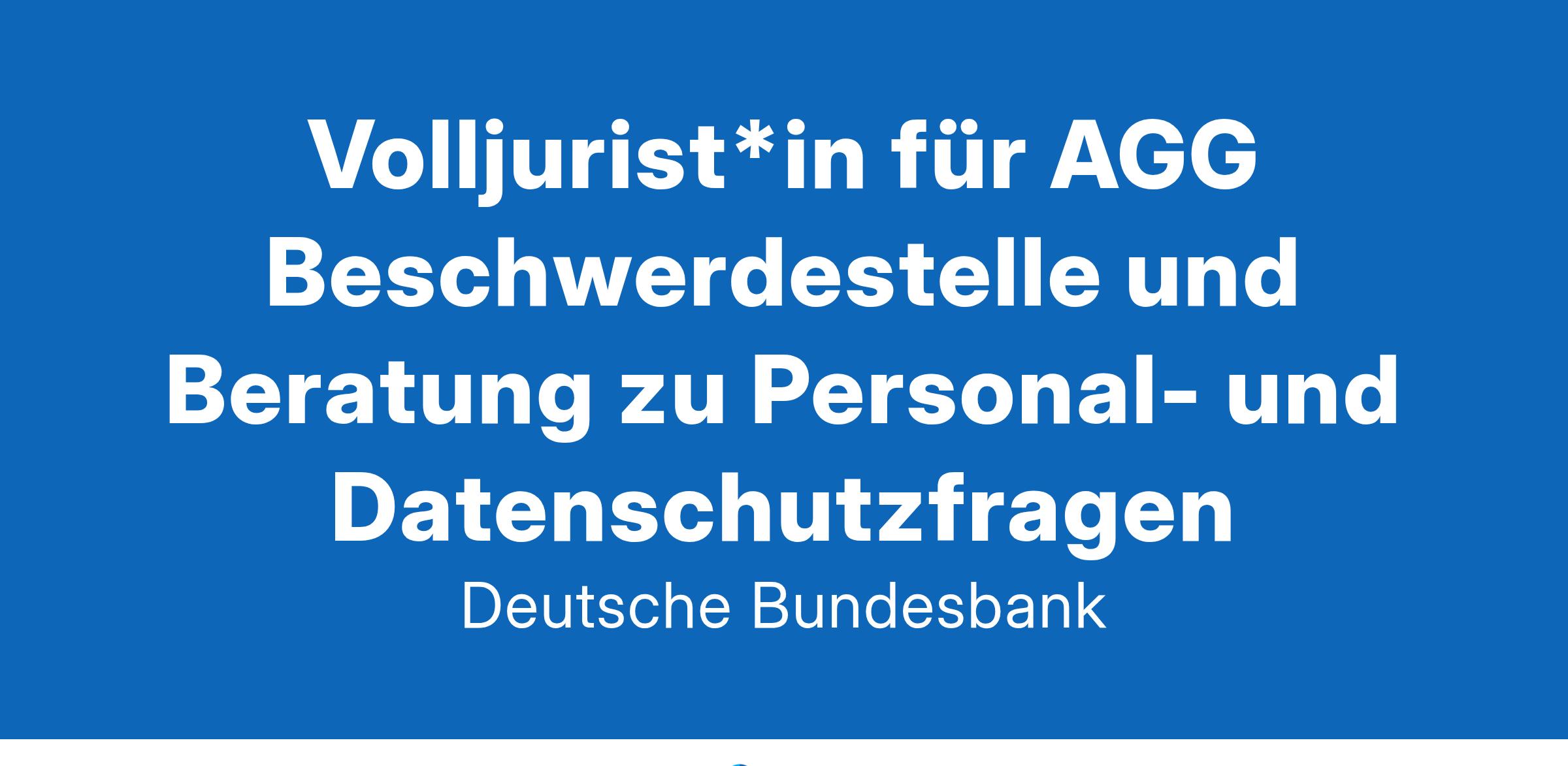 Die Deutsche Bundesbank ist eine besondere Bank. Wir sorgen mit der EZB und den anderen europäischen Zentralbanken für einen stabilen Euro. Dafür und für weitere Zentralbankaufgaben brauchen wir eine große Vielfalt von Spezialistinnen und Spezialisten in den verschiedensten Arbeitsbereichen, damit die Institution funktionieren kann. Werden auch Sie Teil eines starken Teams aus zuverlässigen und verantwortungsbewussten Menschen! Volljurist*in für AGG Beschwerdestelle und Beratung zu Personal- und Datenschutzfragen Arbeitsort: Frankfurt am Main