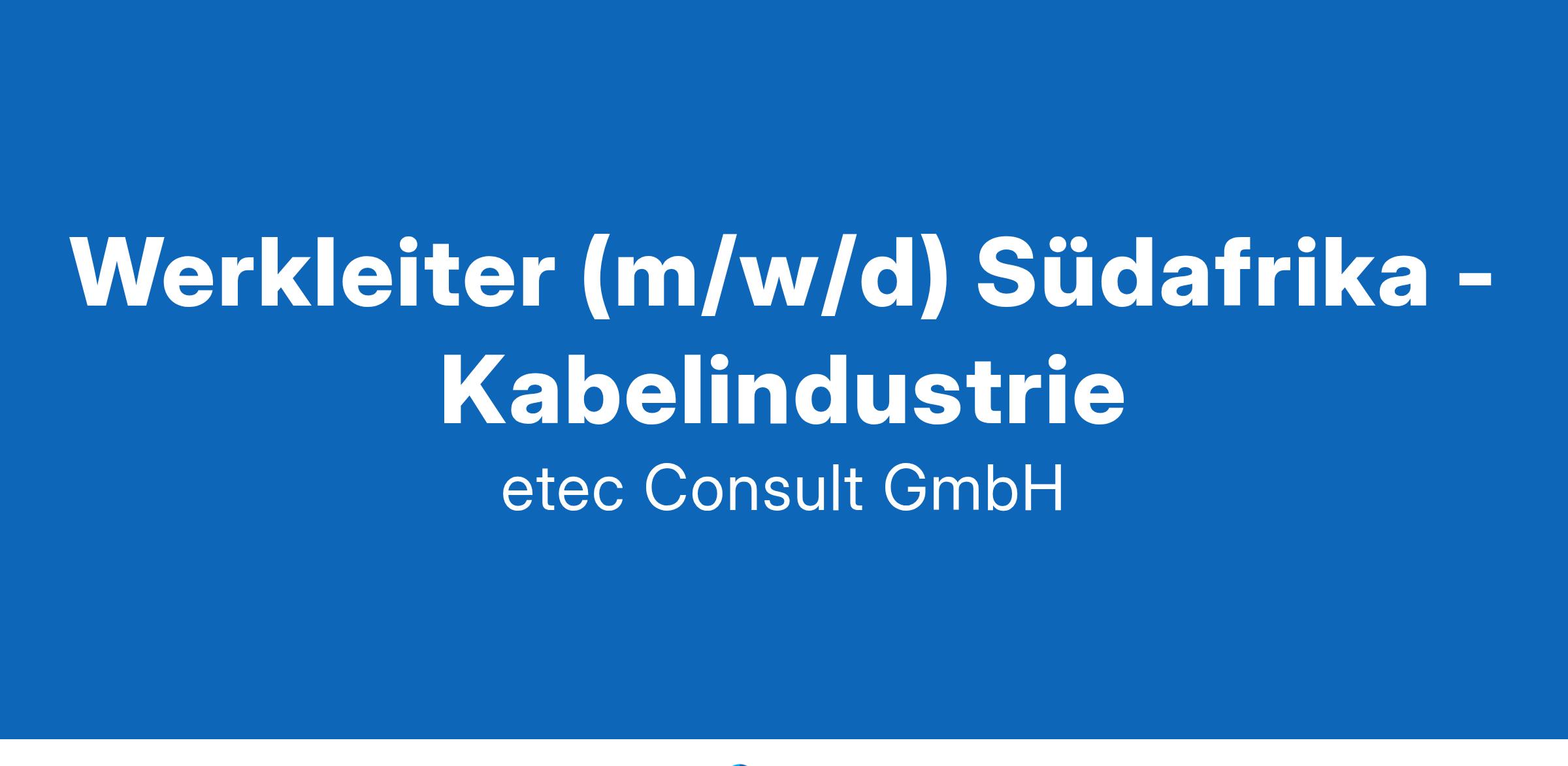 Unser Klient ist ein mittelständischer, sehr erfolgreicher Marktführer im Umfeld der Kabelindustrie mit einem dreistelligen Millionen-Euro-Umsatz. Das Unternehmen zeichnet eine hohe Wertschöpfungstiefe sowie Produktionsstandorte auf mehreren Kontinenten aus. Für das weitere geplante Wachstum des Produktionsstandortes in Südafrika suchen wir Sie als