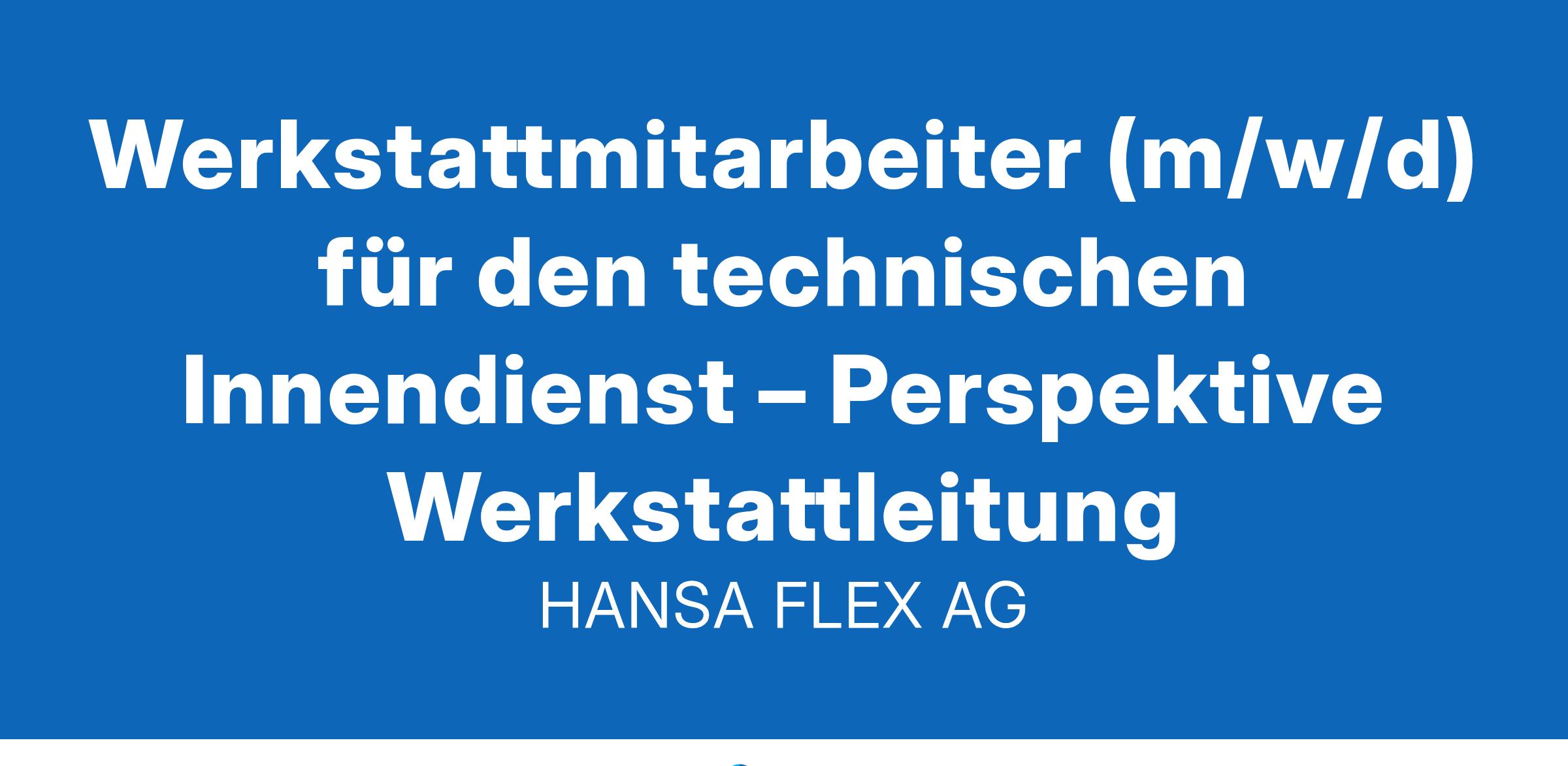 Werkstattmitarbeiter (m/w/d) für den technischen Innendienst – Perspektive Werkstattleitung Hier bewerben! Sie haben ein Herz für Maschinen? Dann sind Sie bei HANSA-FLEX genau richtig! Unsere Mission ist es, Maschinen mit modernster Hydraulik (wieder) zum Laufen zu bringen. Ob Schläuche, Rohre, Pumpen oder Zylinder: Unsere hohen Qualitätsansprüche und unser unermüdlicher Einsatz für den Kunden haben uns zu einem der international führenden Unternehmen für hydraulische Verbindungstechnik gemacht. Das höchste Gut unseres Familienunternehmens sind dabei unsere 5.000 Mitarbeiter*innen. Als wichtigste Stütze unserer kleinen Niederlassung in 71034 Böblingen suchen wir Sie zum nächstmöglichen Zeitpunkt als Werkstattmitarbeiter (m/w/d) für den technischen Innendienst mit Perspektive zur Werkstattleitung. Hier packen Sie mit an: