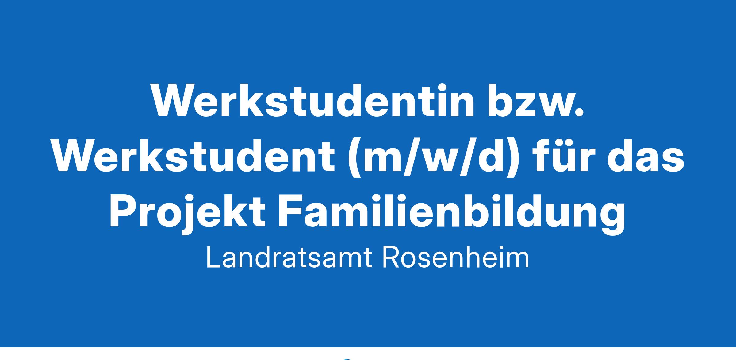Werkstudentin bzw. Werkstudent (m/w/d) für das Projekt Familienbildung Nr. 2025-01-16 Stellenausschreibung Der Landkreis Rosenheim sucht für das Sachgebiet 23 – Kreisjugendamt 15.03.2025 eine Werkstudentin bzw. einen Werkstudenten (m/w/d) für das Projekt „Familienbildung“ Es handelt sich um eine Stelle mit einem Arbeitszeitumfang von zehn bis 20 Stunden wöchentlich zunächst befristet bis 31.12.2025. Das Kreisjugendamt Rosenheim fördert mit seinen rund 150 Mitarbeitenden das gesunde Aufwachsen von jungen Menschen und unterstützt Eltern durch bedarfsgerechte Hilfen und Leistungen bei ihren Erziehungsaufgaben. Wir unterstützen Familien, Kinder und Jugendliche durch konkrete Angebote in der Erziehung und Verselbständigung, wichtig ist uns der präventive Ansatz sowie der Ausgleich individueller Nachteile um Chancengleichheit herzustellen. Familienbildung ist eine präventive, sozialräumliche Unterstützung für Familien. Dabei stehen deren Bedürfnisse und Interessen im Vordergrund und werden altersgerecht in verschiedenen Angebotsformen aufgegriffen. Ziel der sozialräumlichen, strukturierten Angebote ist die Stärkung der Erziehungskraft der Familien, sowie deren Kompetenzen und Ressourcen. Unsere Anforderungen Eingeschriebene Studierende der Fachrichtung Soziale Arbeit oder eines vergleichbaren Studienganges Interesse an Projektarbeit im Bereich der Kinder- und Jugendhilfe Teamorientierung und Engagement Gute IT-Kenntnisse und Interesse an Social Media Freude an organisatorischen, administrativen und netzwerkbezogenen Aufgaben Ihre Aufgaben Mitarbeit in einem Projektteam „Familienbildung“ Mitwirkung bei der Einrichtung eines digitalen Familienbildungsportals Unterstützung bei der Organisation und Durchführung von Veranstaltungen, Arbeitstreffen usw. Wir bieten Eine interessante, abwechslungsreiche Tätigkeit in einem engagierten Projektteams Die Möglichkeit des Kennenlernens eines präventiven Handlungsfeldes der Kinder- und Jugendhilfe Die Eingruppierung erfolgt in der Entgeltgruppe 5 TVöD-VKA (Informationen zu den Verdienstmöglichkeiten unter www.oeffentlicherdienst.info) inkl. einer Leistungsorientierten Bezahlung (LOB) und einer betrieblichen Zusatzversorgungskasse Hauseigene Kantine Fahrtkostenzuschuss bei ÖPNV Nutzung Flexible Arbeitszeiten Schwerbehinderte Bewerberinnen und schwerbehinderte Bewerber (m/w/d) werden bei im Wesentlichen gleicher Eignung bevorzugt berücksichtigt. Bitte nutzen Sie unser Bewerbungsportal, um sich bei uns zu bewerben. Wir freuen uns auf Ihre Bewerbung! Nähere Auskünfte: Auskünfte zum Arbeitsgebiet erteilt Frau Andrea Serwuschok (Tel. 08031/392-2400), für personelle Fragen steht Herr Johannes Römersberger (Tel. 8031/392-1120) zur Verfügung. Bitte bewerben Sie sich ausschließlich über unser Bewerberportal: www.landkreis-rosenheim.de/ ? Karriere ? Stellenangebote. Landratsamt Rosenheim Wittelsbacherstraße 53 · 83022 Rosenheim Tel. 08031 392-01 · Fax 08031 392-9001 www.landkreis-rosenheim.de