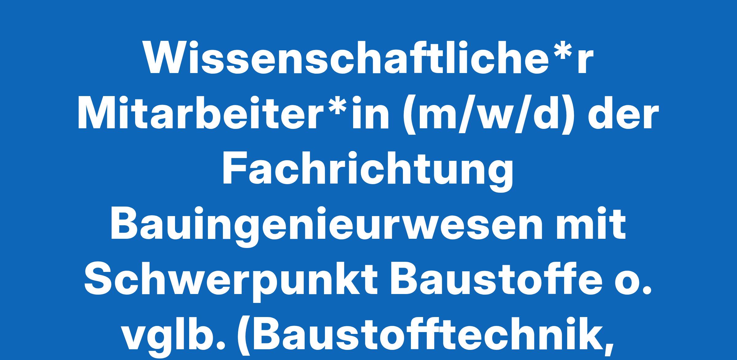 Wissenschaftliche*r Mitarbeiter*in (m/w/d) der Fachrichtung Bauingenieurwesen mit Schwerpunkt Baustoffe o. vglb. (Baustofftechnik, Werkstoffwissenschaften, Bauchemie, anorganische Chemie oder technisc