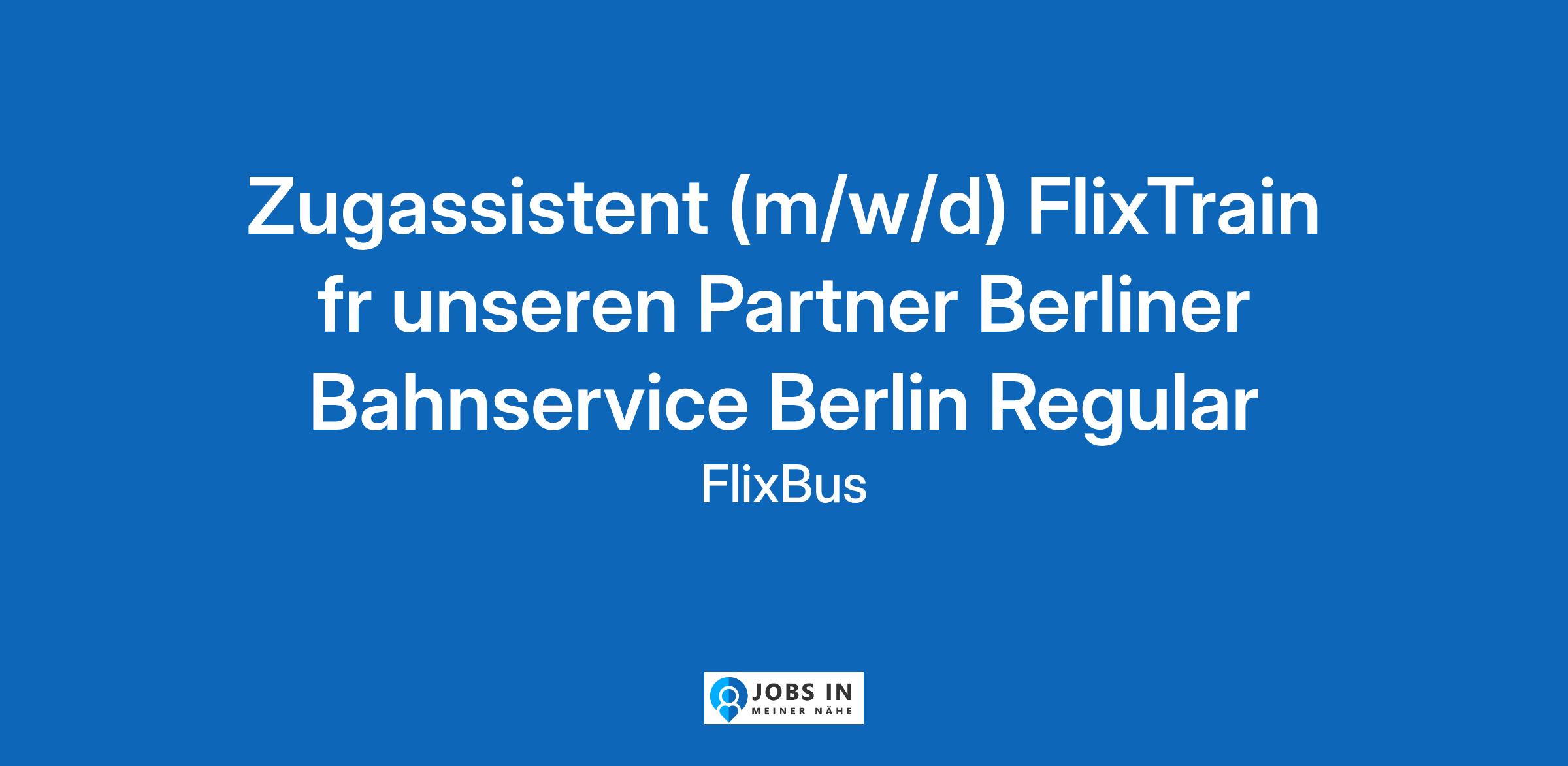 Wir suchen fr unseren Partner Berliner Bahnservice ab sofort ein/e Zugassistent/in (w/m/d) fr FLIXTRAIN-Zge auf der Linie Berlin < > Stuttgart. Durch das Absenden Deiner Bewerbung erklrst du Dich damit einverstanden, dass wir Deine Bewerbung an die Berliner Bahnservice weiterleiten.